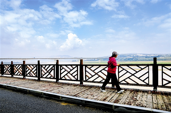 近日,在三门峡沿黄生态廊道上,一名市民迎着微风奔跑健身,脚下是生态步道,眼前是黄河奔涌的壮阔美景,锻炼身体与欣赏秋景两不误。 本报记者 王建栋 摄