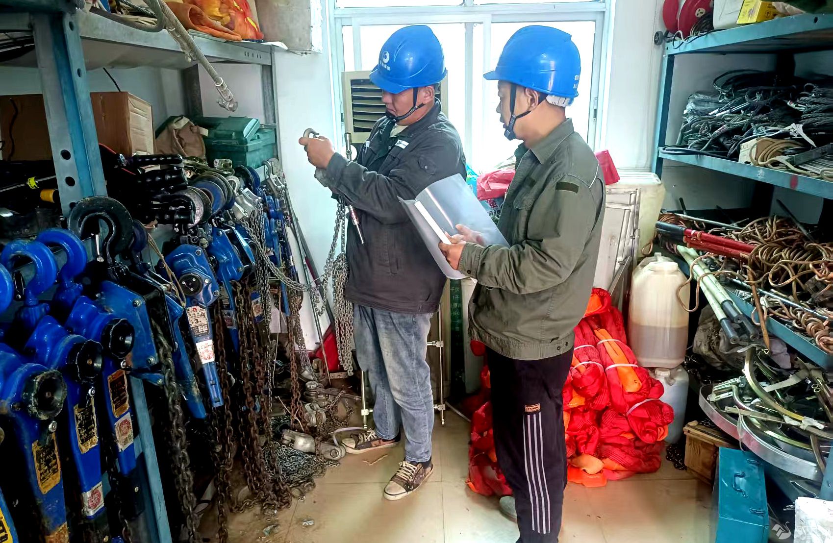 排查过程中,小组人员聚焦常用的手扳葫芦、吊带、挂车、起重工具等关键工器具,按照“查外观、核参数、试性能”的标准逐一核查。一方面,仔细检查工器具是否存在破损、老化、变形等外观问题,核对设备编号、检定有效期等信息,确保每一件工器具“身份合规、状态完好”;另一方面,对部分工器具进行现场性能测试,重点验证绝缘类工具的绝缘性、起重类工具的承重稳定性,坚决杜绝“带病”工器具投入使用。