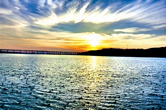 11月19日,黄河三门峡水域,落日熔金洒长河,绚烂晚霞铺天际,成群水鸟在水中觅食,与横跨两岸的大桥相映成趣,光影交织间勾勒出“天鹅之城”水天一色的壮丽画卷。 本报记者 王建栋 摄 ( 编辑:tln ) |