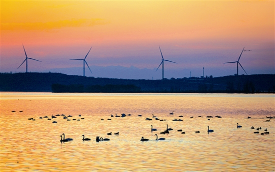 三门峡市城乡一体化示范区的黄河岸边,夕阳铺洒河面,天鹅悠然游弋,勾勒出一幅灵动秀美的生态画卷。