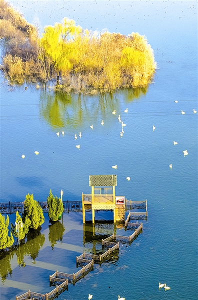 冬日暖阳下,成群白天鹅在水面嬉戏,与水中栈道、岸边金柳相映成趣,绘就一幅生态和谐的美丽画卷。