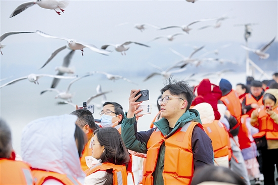 游客在“天鹅号”游轮上与成群红嘴鸥相遇,成为冬日一道亮丽的风景。