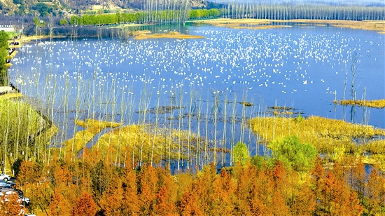 黄河湿地灵宝段后地天鹅观景点迎来了大规模越冬天鹅群。