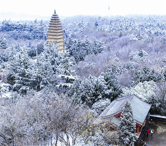 宝轮寺塔迎雪而立与皑皑白雪相映成趣,勾勒出一幅静谧悠远的冬日古建画卷。