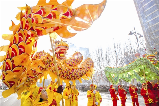 3月3日,元宵节。我市各地群众敲锣打鼓,载歌载舞,进行社火表演,以不同的形式庆祝元宵佳节。图为陕州区陕州大道正在进行的元宵节社火舞龙表演。杜杰 摄