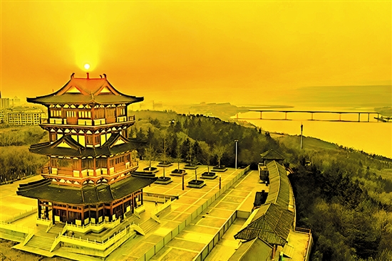 近日拍摄的三门峡黄河公园禹王阁日落盛景,阁楼在落日余晖中与黄河、大桥、山峦相映成趣,尽显“长河落日圆”的雄浑诗意。 杜杰 摄
