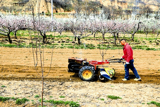 3月25日,陕州区甘棠街道柳林村,农民正在操作小型农机耙平果树行间土地,为春种作准备。 本报记者 王建栋 摄
