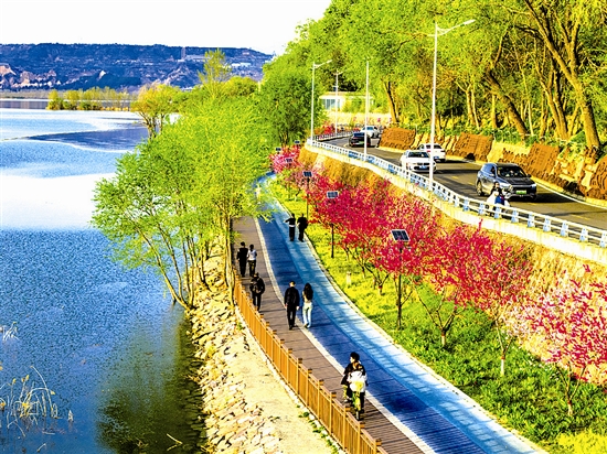 4月3日,陕州公园黄河岸边步道上市民悠然漫步、赏景,行车道上车流有序行驶。