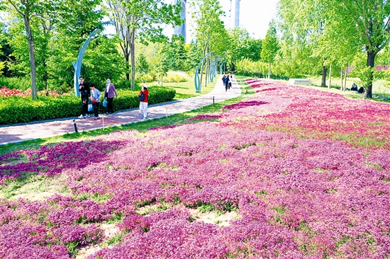 4月18日,三门峡天鹅湖国家城市湿地公园南门岩石花园内福禄考花竞相绽放,吸引游客驻足观赏。 本报记者 王建栋 摄