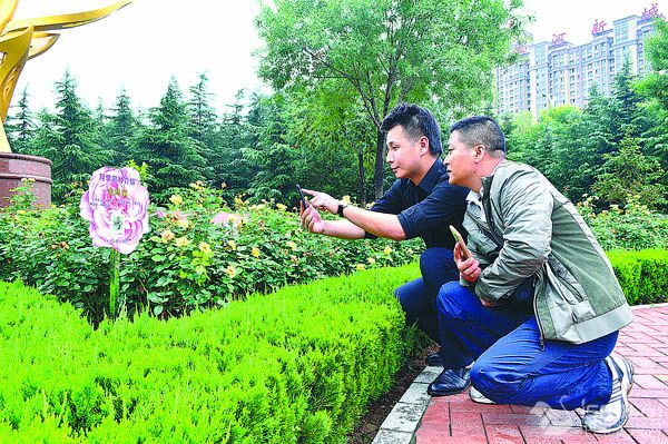 ![]() 涧河公园配图:市民正在扫码赏花 张茜 摄