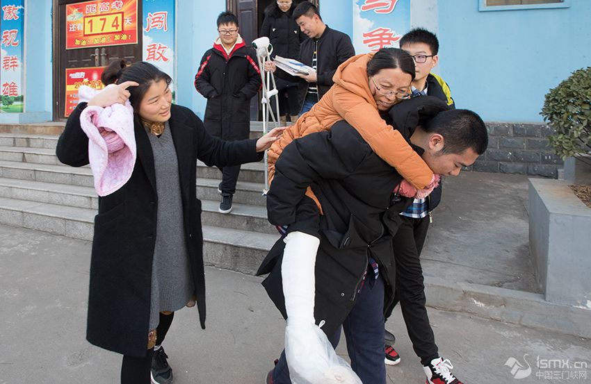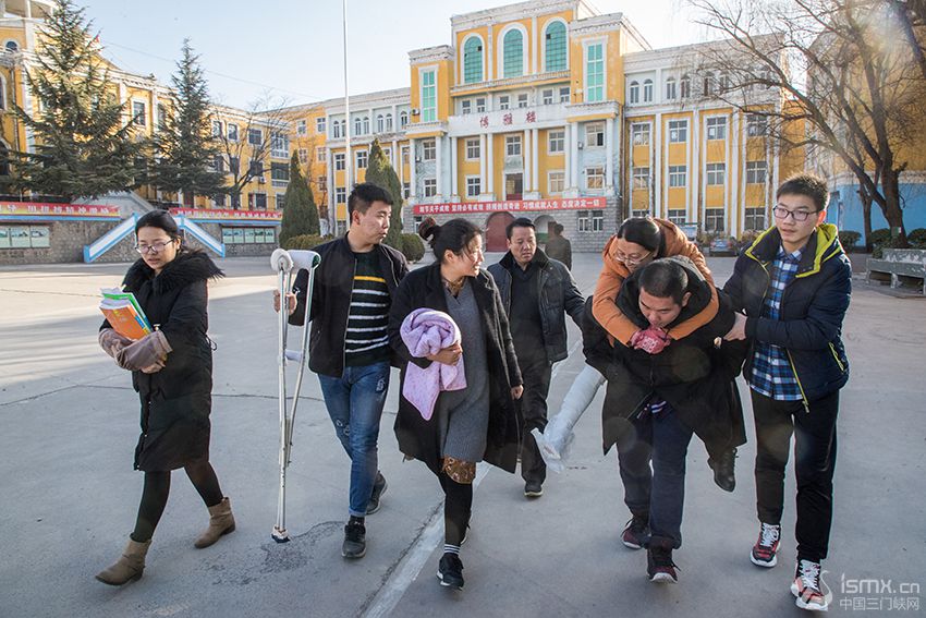 ![]() 另一个教室不在一栋楼里,这位男同学背着她上下楼,很多学生纷纷来帮忙。