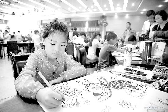 9时许,比赛正式开始。孩子们或选择素描,或选择国画,还有的选择蜡彩,绘画手法各不相同。而绘画内容也丰富多彩,有惟妙惟肖的动物、形象生动的卡通人物,还有赏心悦目的风景,天马行空的创作令观众啧啧称奇。8岁的冀文青说:“我非常喜欢白天鹅,现在又正值旅游节,我就画了白天鹅在天鹅湖里嬉戏的美景,借此欢迎外地游客来三门峡做客!以这种方式过‘六一’真棒!”7岁的张和梅画了一大一小两只手,分别代表自己和家人,她希望一家人能永远开心生活。张和梅的妈妈说:“比赛很有意义,既能让孩子体验比赛的乐趣,互相交流绘画技巧,也给家长提供了交流教育心得的平台。”