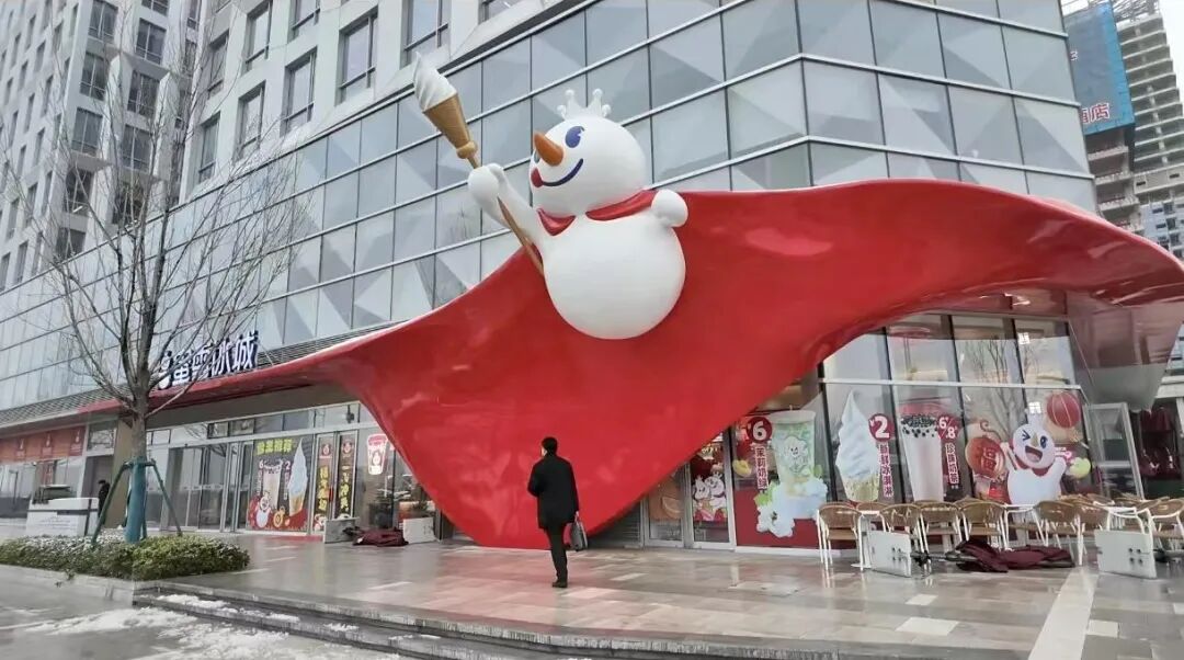 从郑州东站东广场出发 步行10分钟 便能看见蜜雪冰城总部旗舰店 呆萌可爱的 “雪王”“雪妹”CP形象 在醒目的“飞天雪王”门头下 蜜雪冰城的网红单品冰淇淋 以每个2.5元的亲民价格亮相 年轻消费者们排队抢购