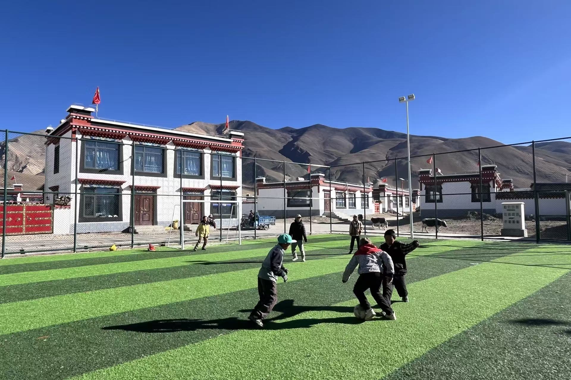 12月26日,灾后重建的长所乡森嘎村,孩子们在人造草坪的足球场上拼抢 2025年的最后几天,定日的学校已经放寒假。灾后重建的村庄里,孩子们有了新的足球场。虽然没有像去年那样特意为他们组织的比赛,但在2025年的最后一个星期六,这片土地上有两场更受关注的角逐。 和过去一年内地多个省份此起彼伏的足球联赛一样,日喀则市第十二届“体彩杯”足球赛也有专业的视频直播。