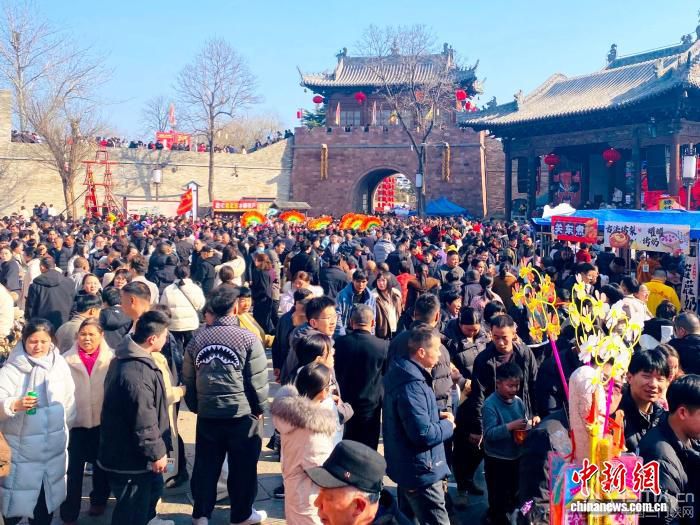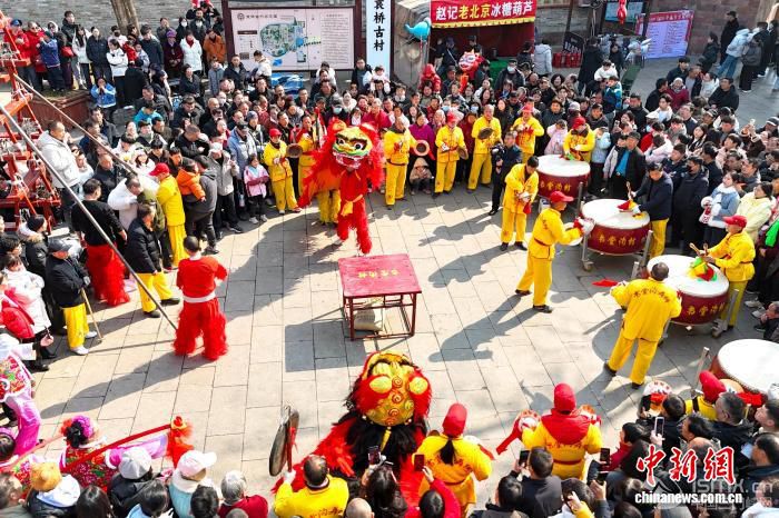 2月17日,农历正月初一,被誉为“微短剧之村”河南登封袁桥古村吸引众多游客前来打卡体验。据了解,自2024年以来,已有超过50部微短剧在此取景拍摄。图为民俗表演吸引游客围观。 刘杨迪 摄