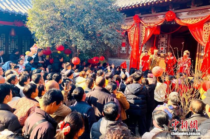 2月17日,农历正月初一,被誉为“微短剧之村”河南登封袁桥古村吸引众多游客前来打卡体验。据了解,自2024年以来,已有超过50部微短剧在此取景拍摄。图为“员外招婿”表演吸引游客围观。 刘杨迪 摄