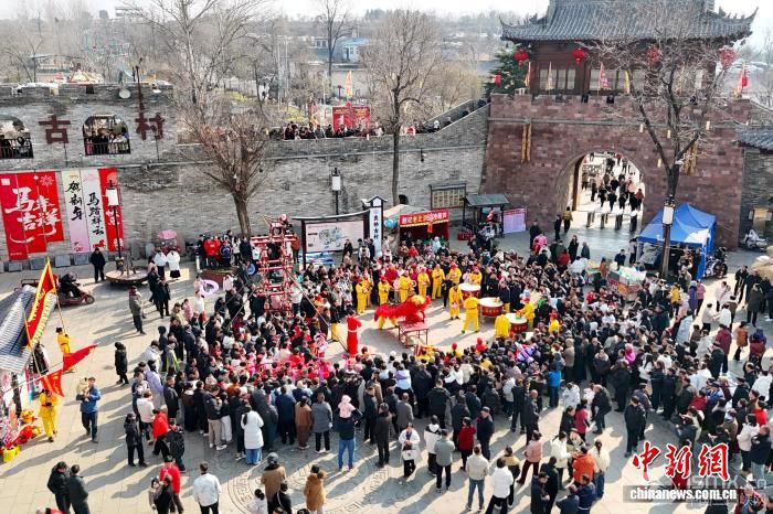 2月17日,农历正月初一,被誉为“微短剧之村”河南登封袁桥古村吸引众多游客前来打卡体验。据了解,自2024年以来,已有超过50部微短剧在此取景拍摄。图为民俗表演吸引游客围观。(无人机照片) 刘杨迪 摄