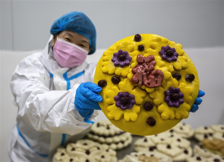 当家乡味道撞上流量时代 人们不禁要问 河南馒头 凭什么征服千里之外的南方胃 让我们一起来探究 河南馒头产业的真功夫 鹤壁市浚县白寺镇郭村憨石磨面业食品生产作坊,员工正在展示传统工艺、铁锅蒸的花馍——四季有“福”。
