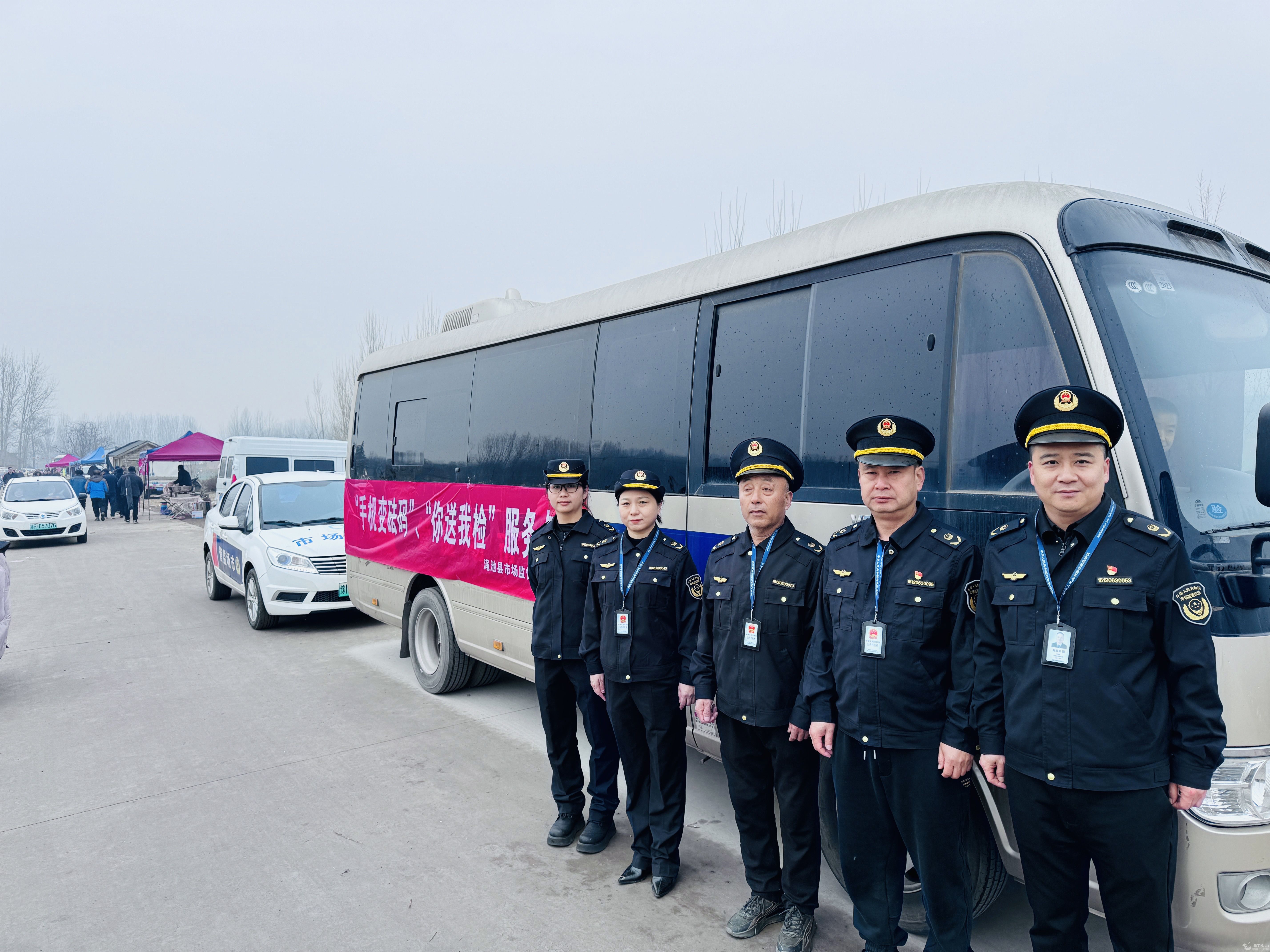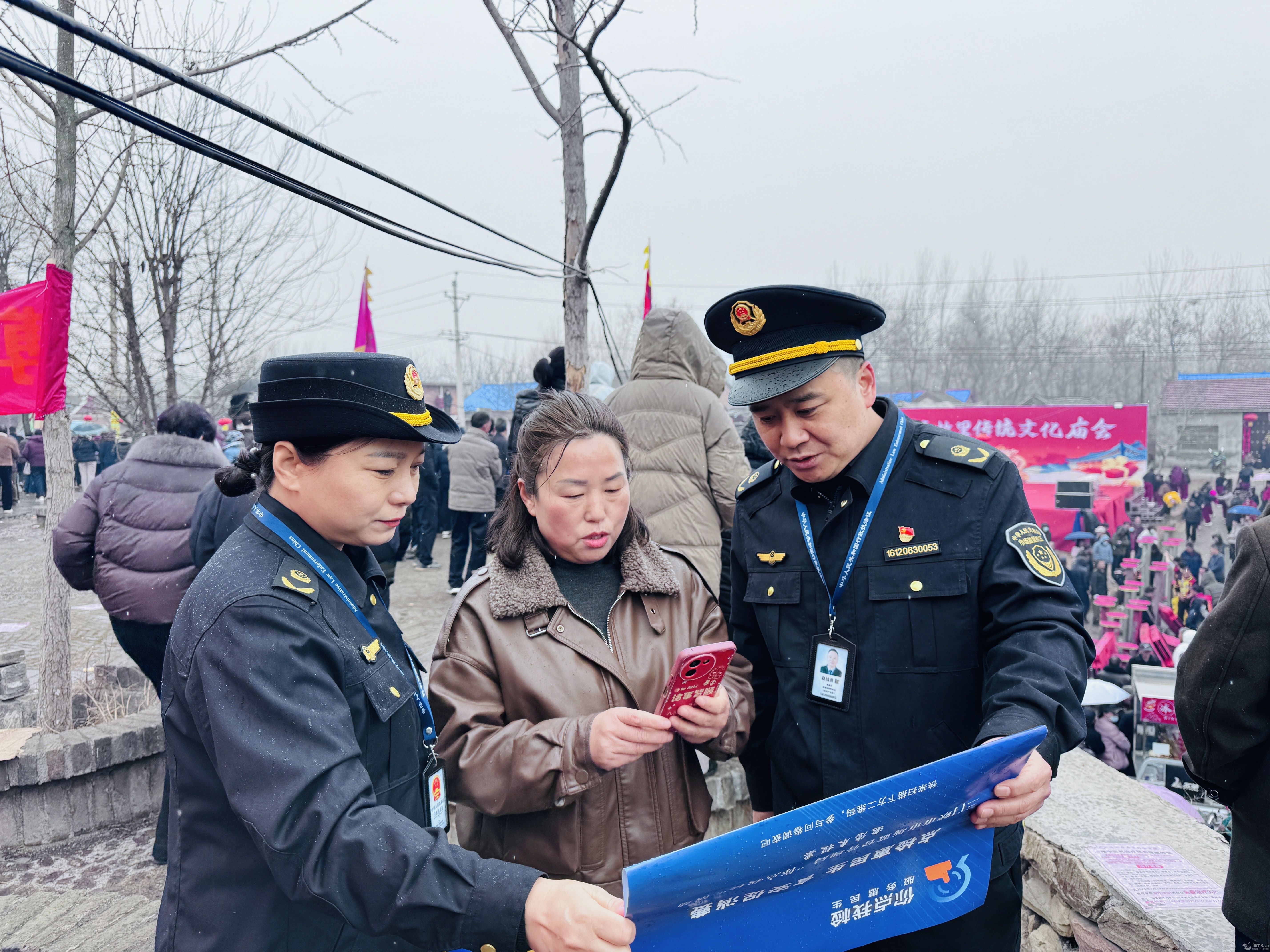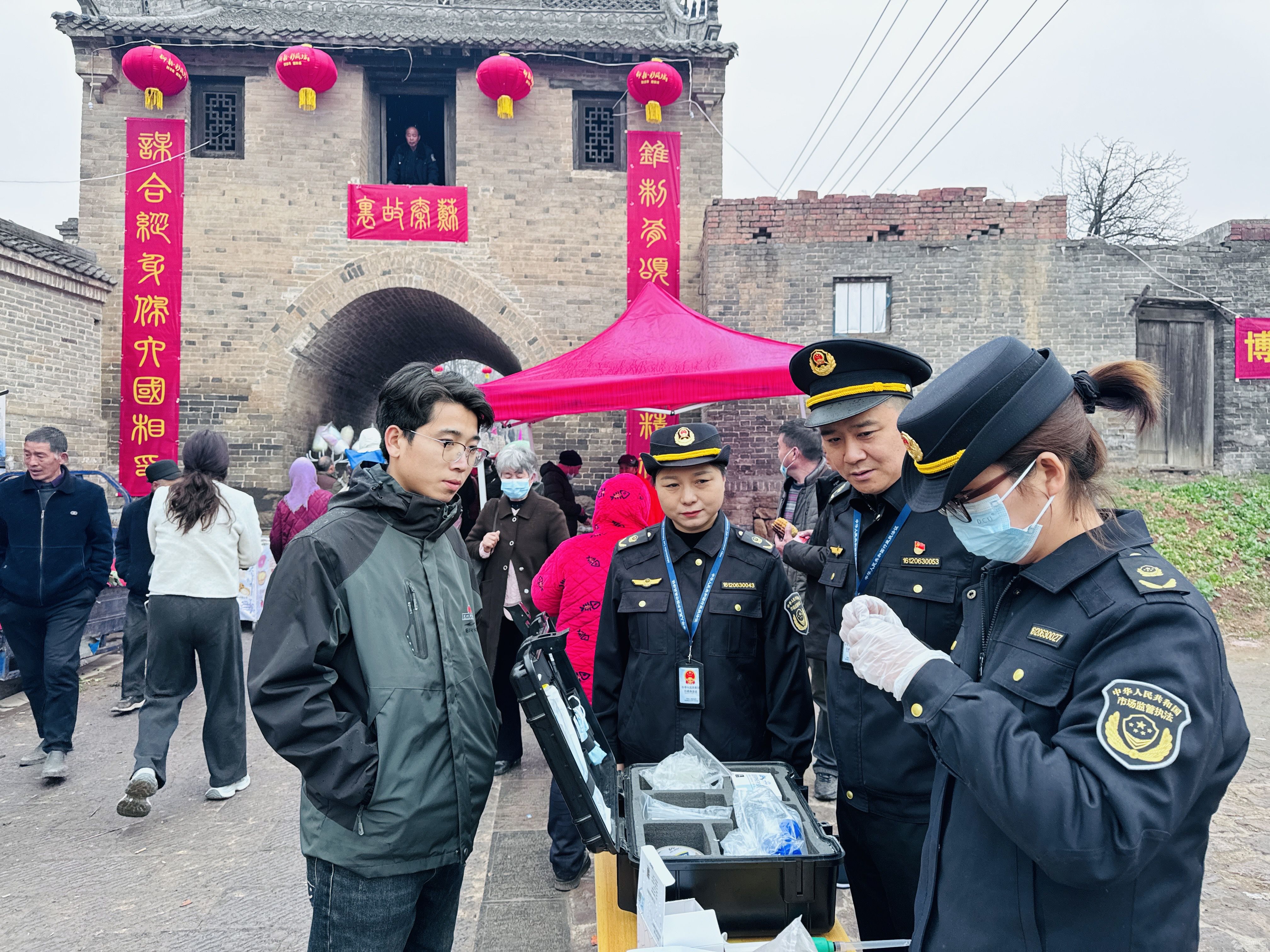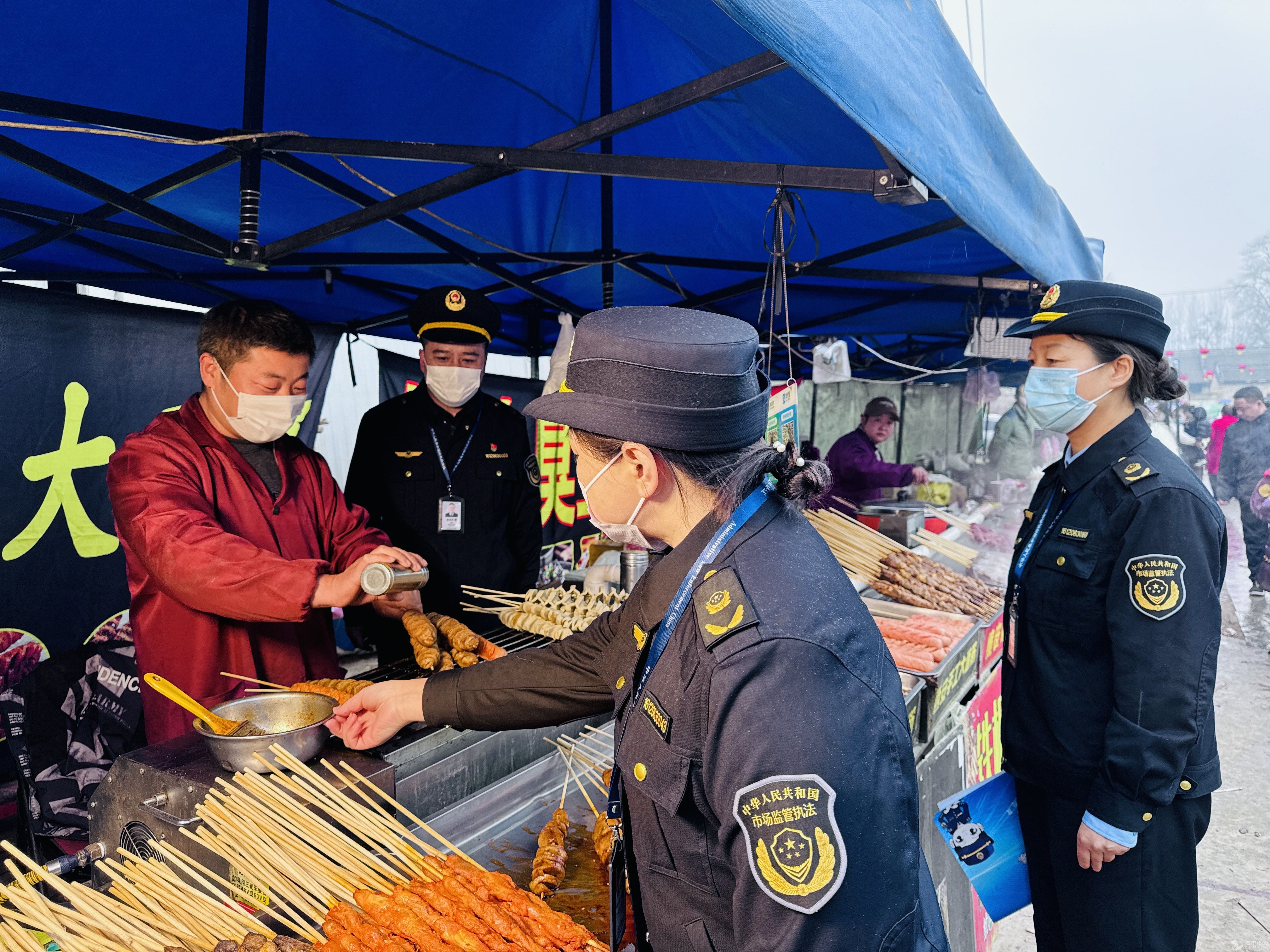 逛庙会、品美食,是乡村老百姓生活中的一件大事。庙会人员流动大、流动摊贩多、经营业态杂,食品安全隐患也会随之增多。河南省渑池县市场监管局因地制宜,将“你送我检”活动、食品安全监管触角延伸至庙会流动食品摊贩,让老百姓“零距离”感受并参与到快检活动中来,为热闹非凡的庙会增添一份食品安全保障。图为3月13日,渑池县张村镇苏秦村庙会现场,执法人员正在开展食品安全知识宣传和“你送我检”活动。(梁小卫)