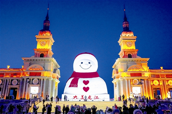1月10日,游客在哈尔滨市群力音乐公园的大雪人前打卡拍照。 时下,冰城哈尔滨市正值冰雪旅游旺季。位于哈尔滨市群力音乐公园的大雪人吸引着众多游客前来打卡。日落后的蓝调时刻,在天光与灯光的交相映照下