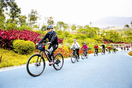 1月10日,骑行爱好者在云南省昭通市巧家县滨江休闲运动生态廊道生态绿湾骑行。新华社发